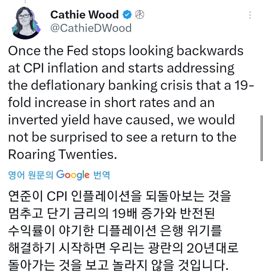 캐시 우드가 현 시점의 경제가 1920년대와 흡사하다며 트위터에 글을 올림…