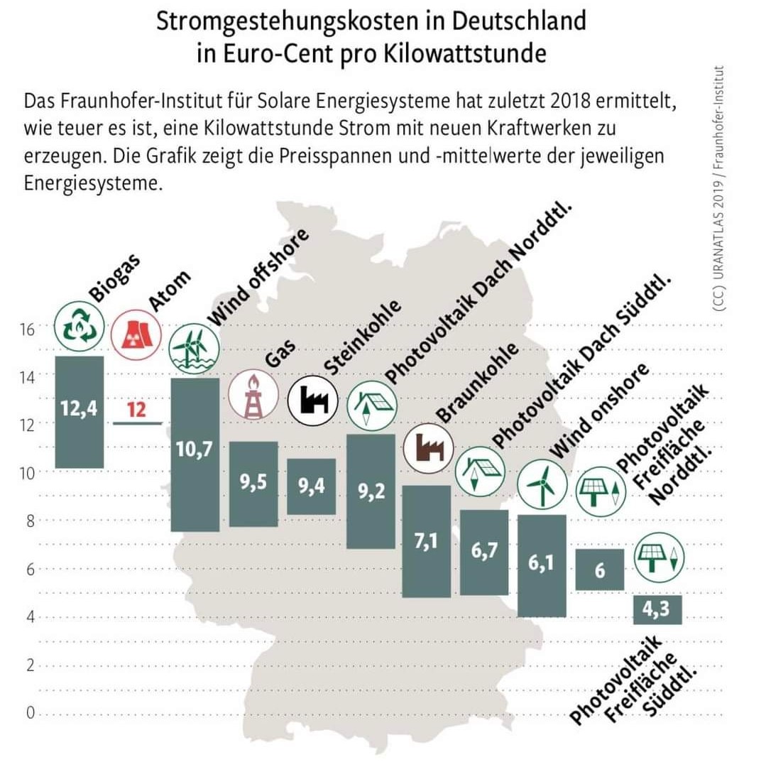 여기에 지역 #PV의 경우 ~5ct/kWh의 #EE 비용과 풍력의 경우 ~6ct를 더하면 시스템 비용은 8.3~9.3ct/kWh로 #원자력의 주요 비용인 12ct/kWh보다 훨씬 낮습니다. 힌클리 포인트 C는 35년 동안 12.3ct/kWh의 가격을 보장합니다. 12.3ct/kWh의 가격. 2/4