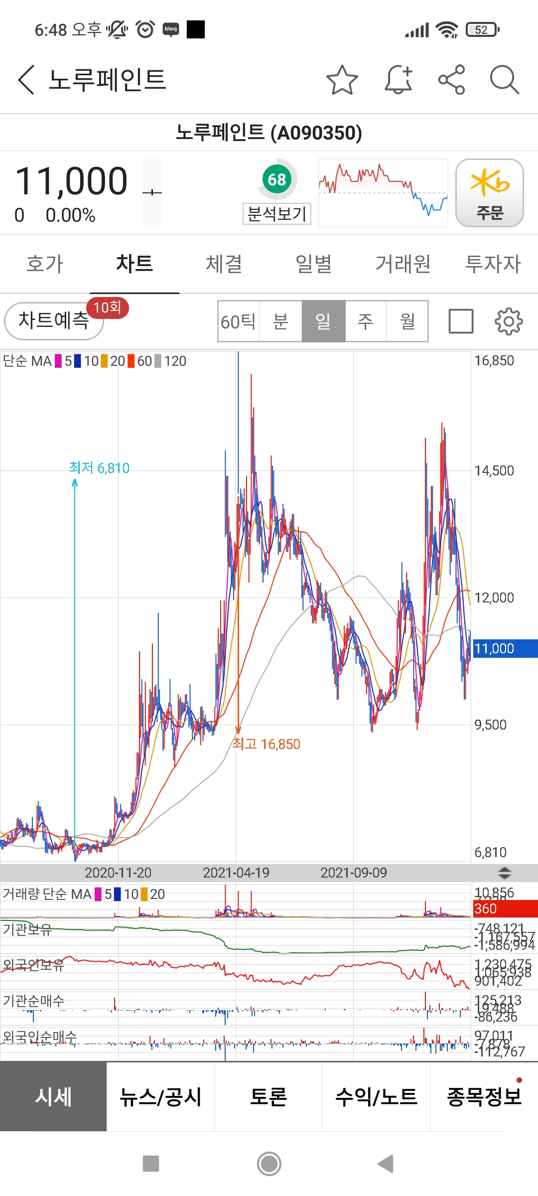 개인기법이나 외인이 좀더 집중해서 매매해주길 기다려야하는데, 지금은 외인매수가 없어서