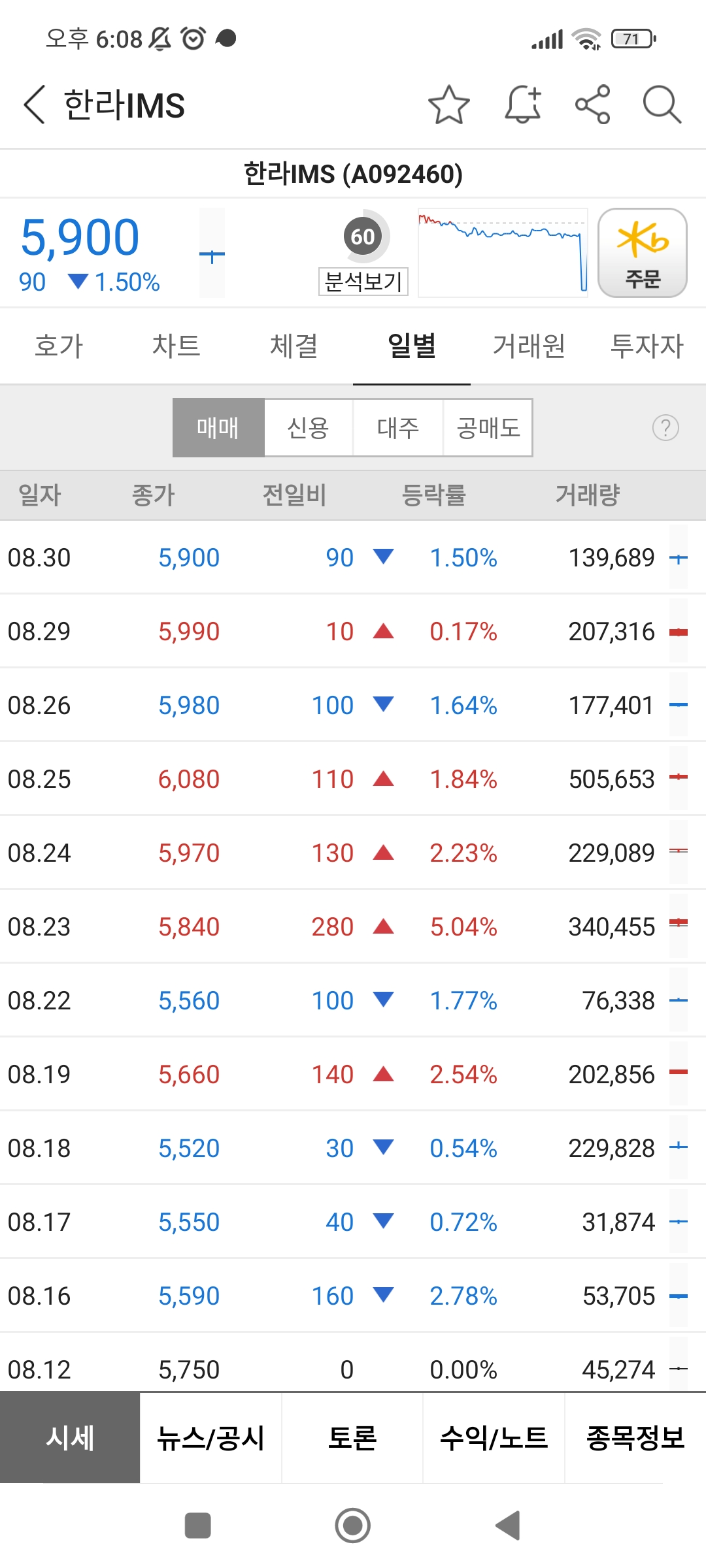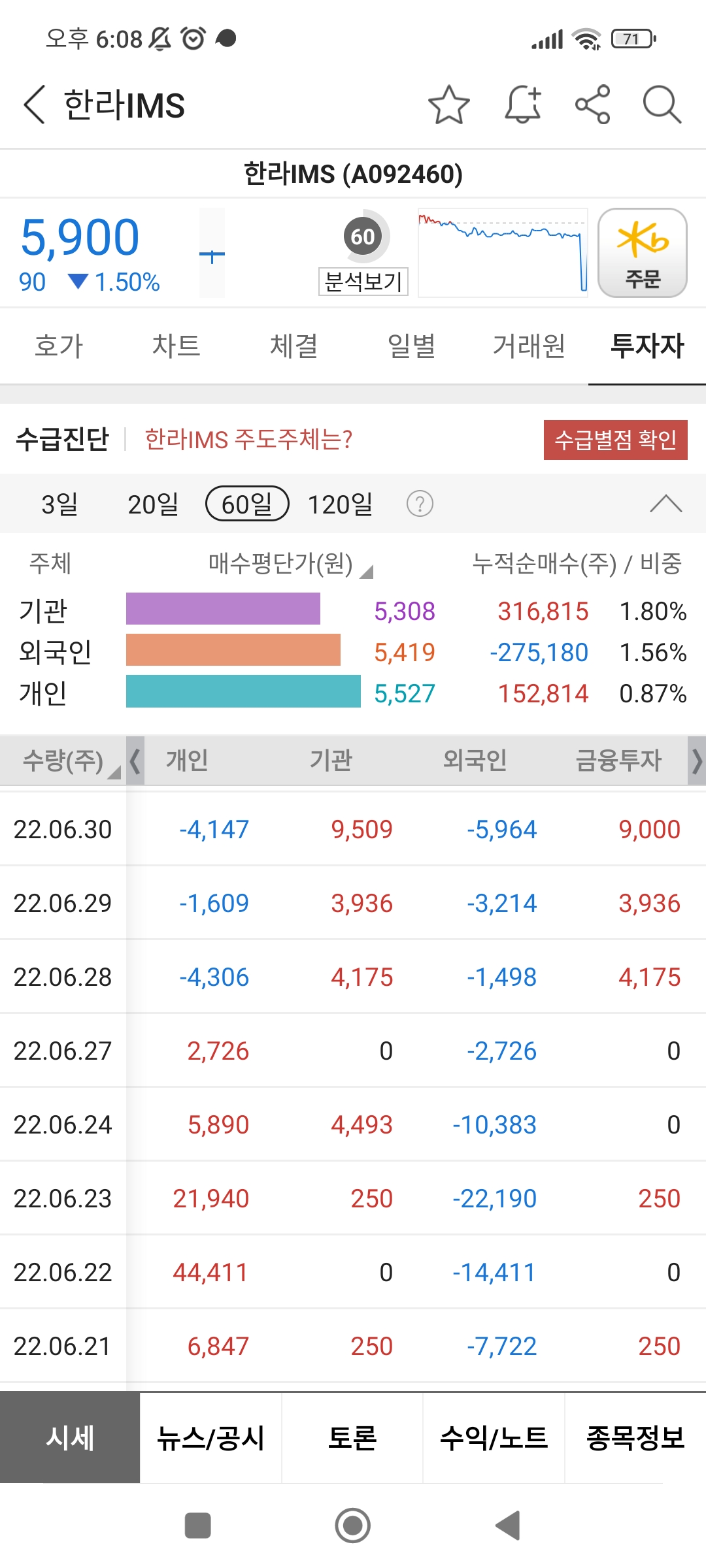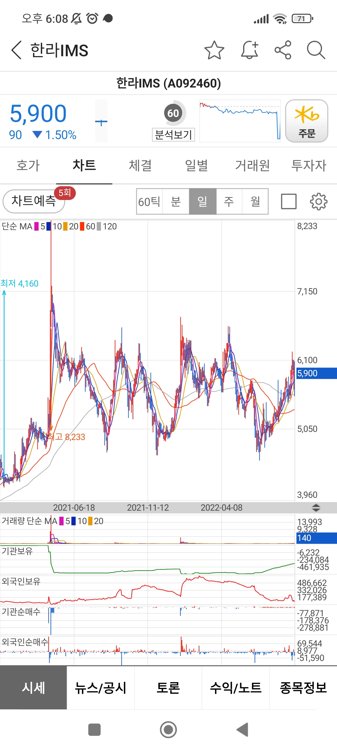 6100원이 단기 최대매물대라 이근처에서 반절은 매도하고