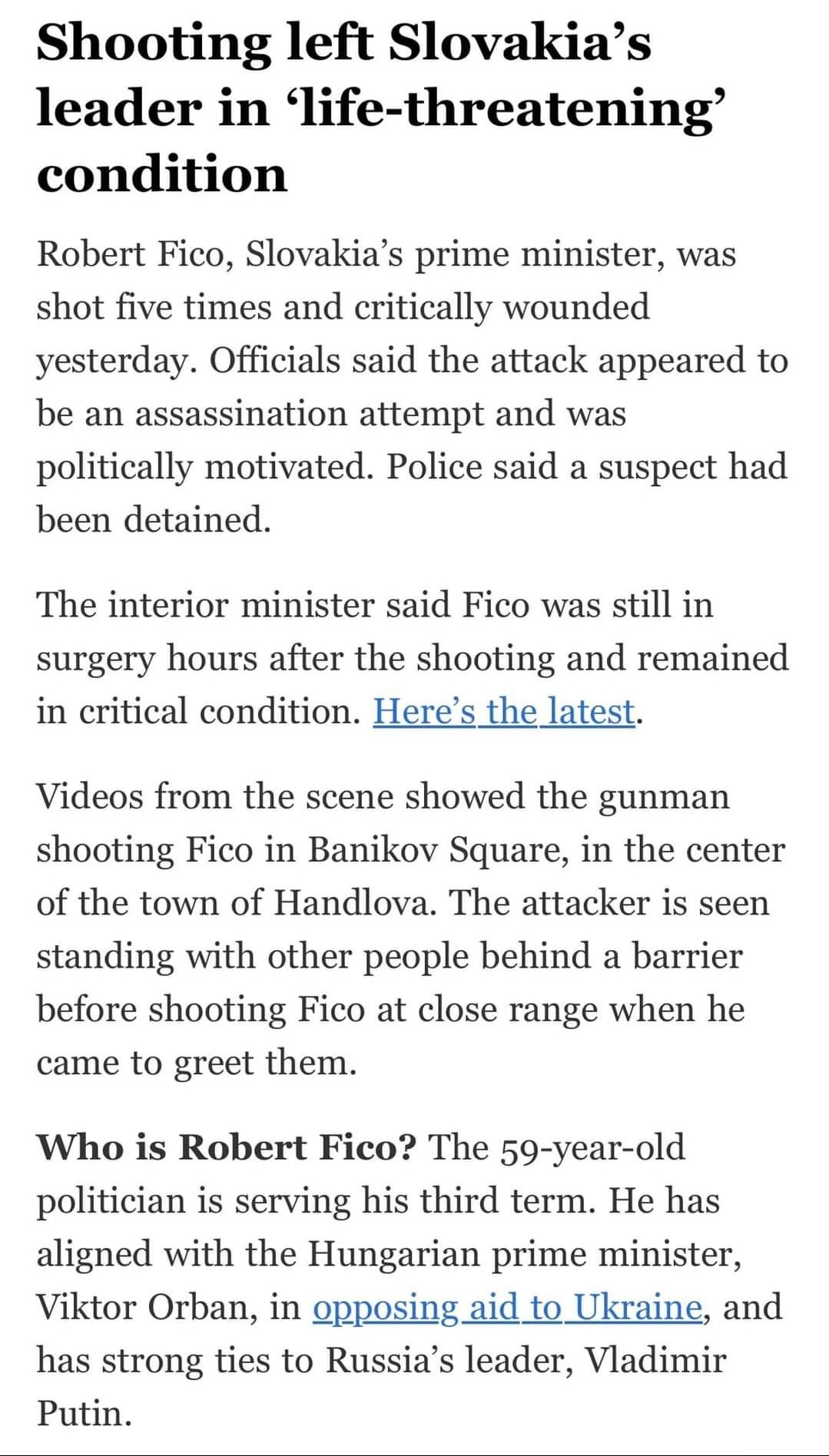 Robert Fico, Slovakia's prime minister, was shot five times and critically wounded yesterday. Officials said the attack appeared to be an assassination attempt and was politically motivated. Police said a suspect had been detained